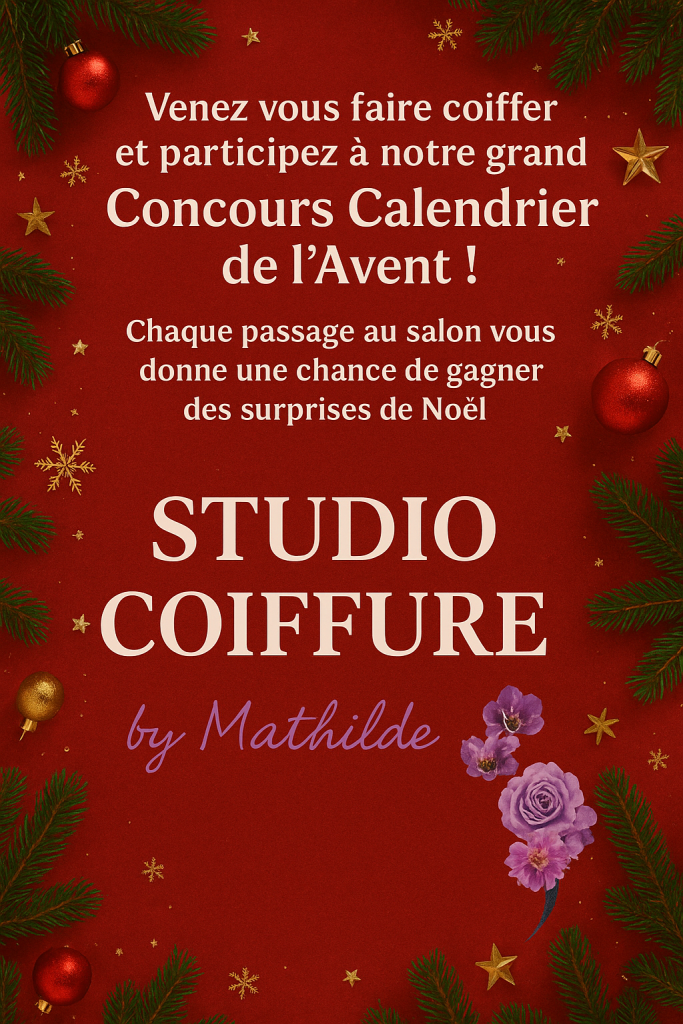 20 novembre 2025Pour célébrer la magie de noël, Studio coiffure by Mathilde organise son grand concours calendrier de l’avent!