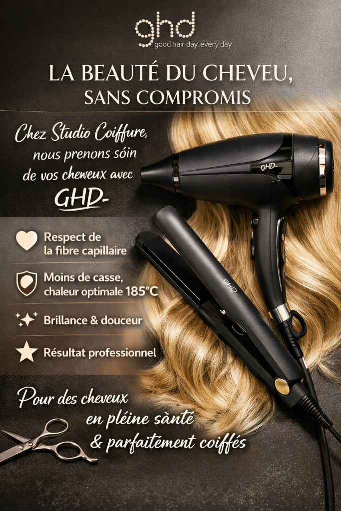 29 janvier 2026Chez Studio Coiffure, la santé de vos cheveux est une priorité absolue. C’est pour cette raison que j’ai choisi de travailler avec la marque GHD, une référence incontournable dans le monde de la coiffure professionnelle.